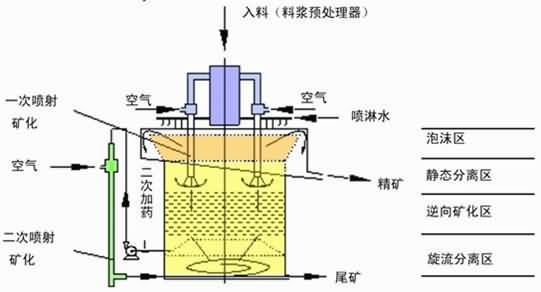 該機的主體結構通常是一個帶充氣器(氣泡發生器)的圓柱形筒體(亦可是正方形或矩形柱),筒體內附有給礦裝置,泡沫溢出或刮出裝置以及泡沫槽、壓縮空氣輸入管網和風包等。(見圖)浮選柱工作時,經藥劑調和好的礦漿由柱體中上部的給礦裝置給入;壓縮空氣經輸入管網和風包,然后透過多孔介質(如微孔塑料短管)從柱體底部鼓入,使在柱體內形成大量細小氣泡。礦粒在重力作用下緩緩下降,氣泡穿過向下流動的礦漿升浮,礦粒與氣泡通過逆流接觸與碰撞,實現氣泡選擇性礦化。(見氣泡礦化)礦化氣泡升浮至礦液面聚集形成泡沫層,溢出或用刮板刮出后得泡沫產品(一般為精礦);尾礦則由柱底借助提升裝置排出。柱體內自礦漿給入口至柱頂稱為精選區,主要作用是提高泡沫產品的品位;由礦漿給入口至柱底稱為捕集區,主要作用是捕集欲浮出的目的礦物,提高回收率。