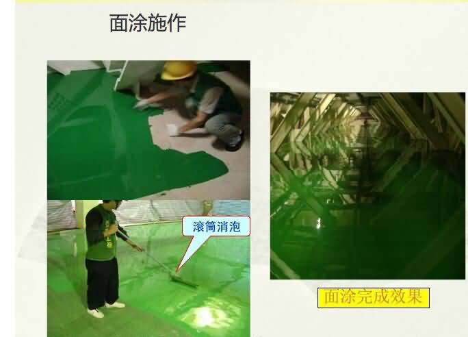 5.面涂層:①施工前需保持干凈如有雜物粘附需清除;②使用前主劑先攪拌均勻;③依照正確比例將主劑及硬化劑混合,充分攪拌;④使用滾筒或鏝刀將材料均勻涂布混合完成材料需30分鐘以內施工完成;⑤施工交接處需做好交接處理;⑥施工完成后,24小時后方可上人,7天后方可重壓(以250C為準,低溫時開放時間需適度延長)。
