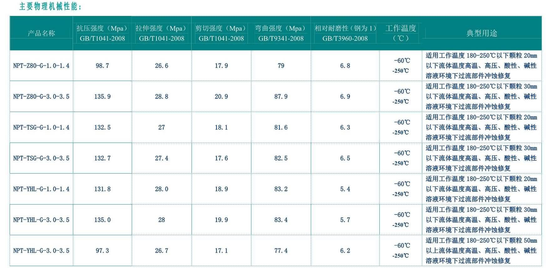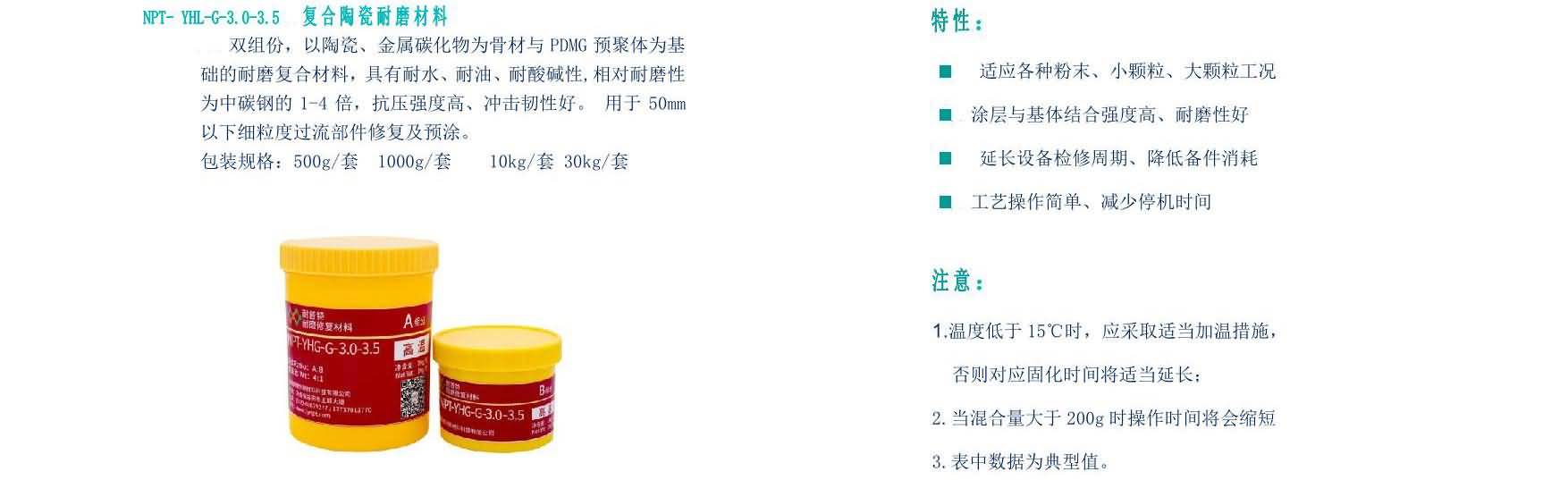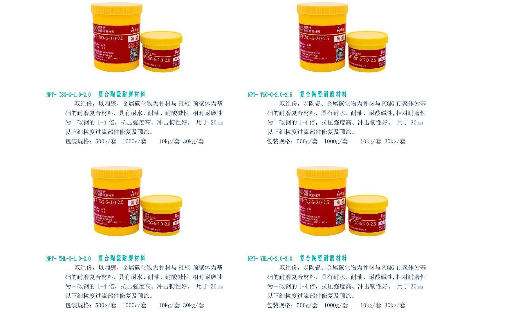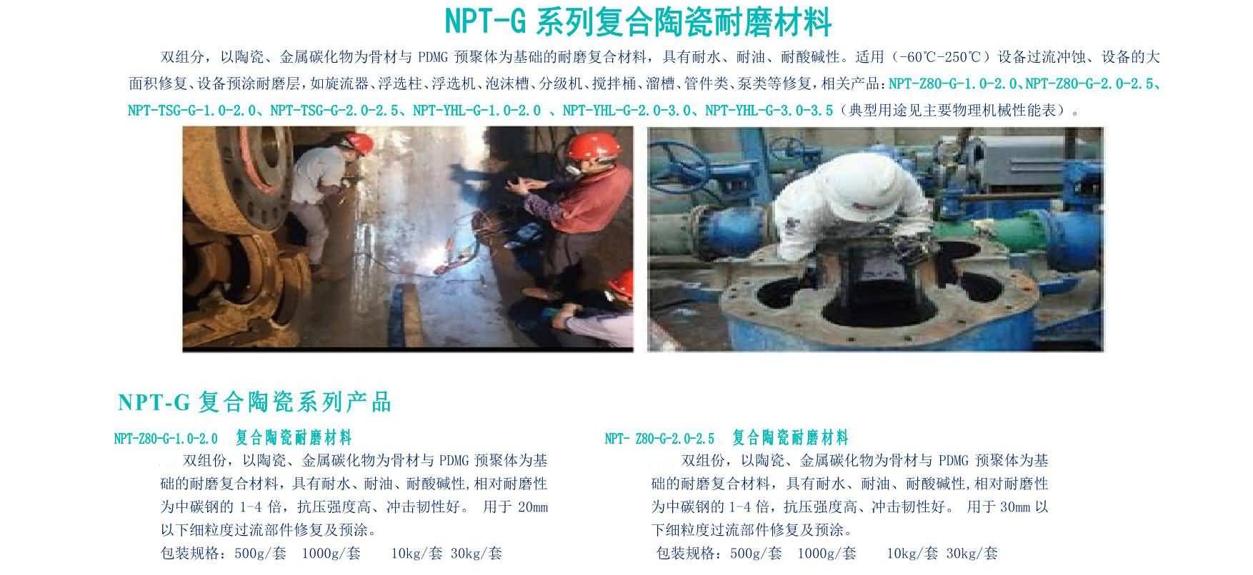 NPT-高溫復合耐磨材料雙組分,以陶瓷顆粒及復合陶瓷顆粒、金屬碳化物為骨材與PDMG預聚體為基礎的耐磨復合材料,具有耐水、耐油、耐酸堿性。適用(-60℃-250℃)設備過流沖蝕、設備的大面積修復、設備預涂耐磨層,如旋流器、浮選柱、浮選機、泡沫槽、分級機、攪拌桶、溜槽、管件類、泵類等修復(典型用途見主要物理機械性能表)。