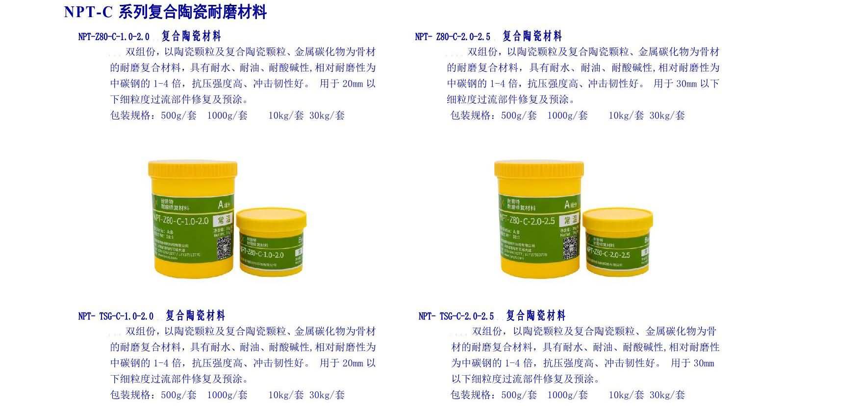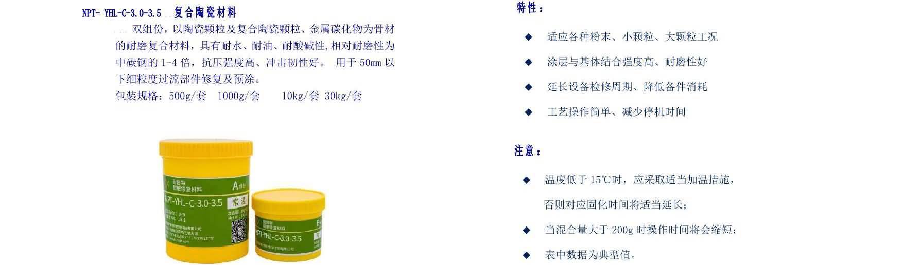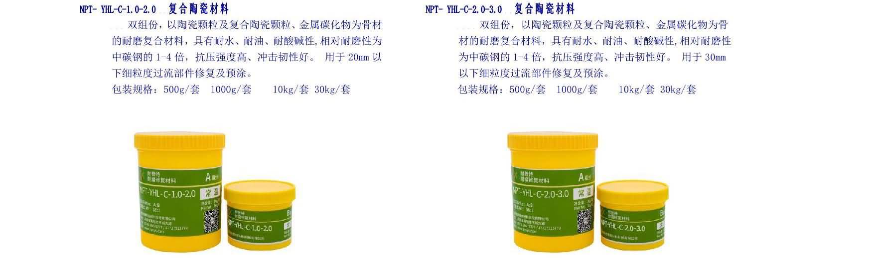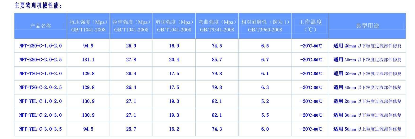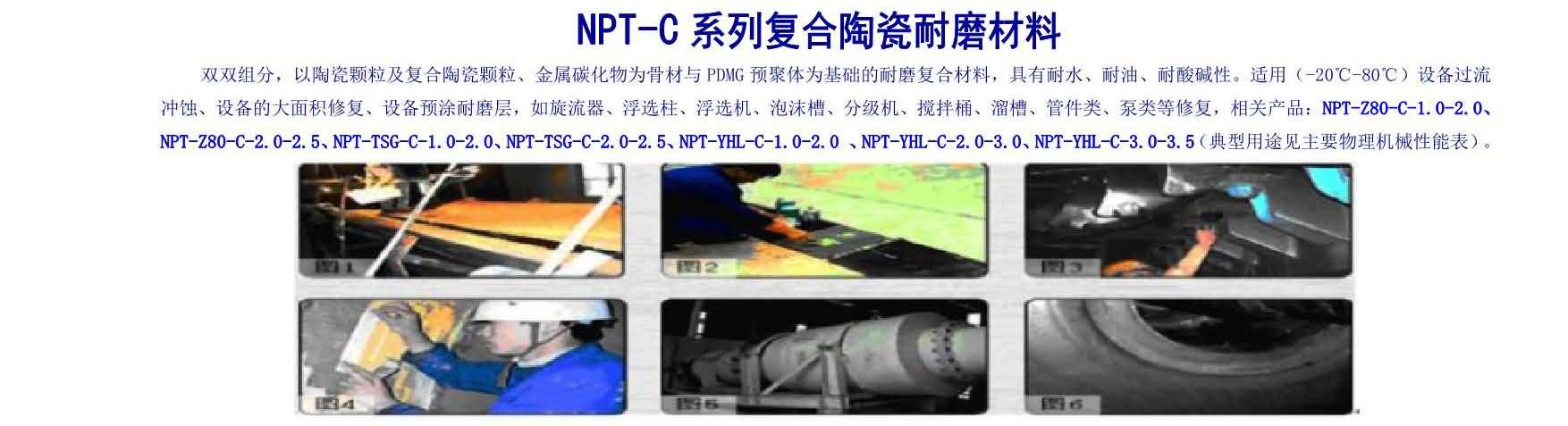 NPT-常溫復合耐磨材料雙組分,以陶瓷顆粒及復合陶瓷顆粒、金屬碳化物為骨材與PDMG預聚體為基礎的耐磨復合材料,具有耐水、耐油、耐酸堿性。適用(-60℃-80℃)設備過流沖蝕、設備的大面積修復、設備預涂耐磨層,如旋流器、浮選柱、浮選機、泡沫槽、分級機、攪拌桶、溜槽、管件類、泵類等修復(典型用途見主要物理機械性能表)。