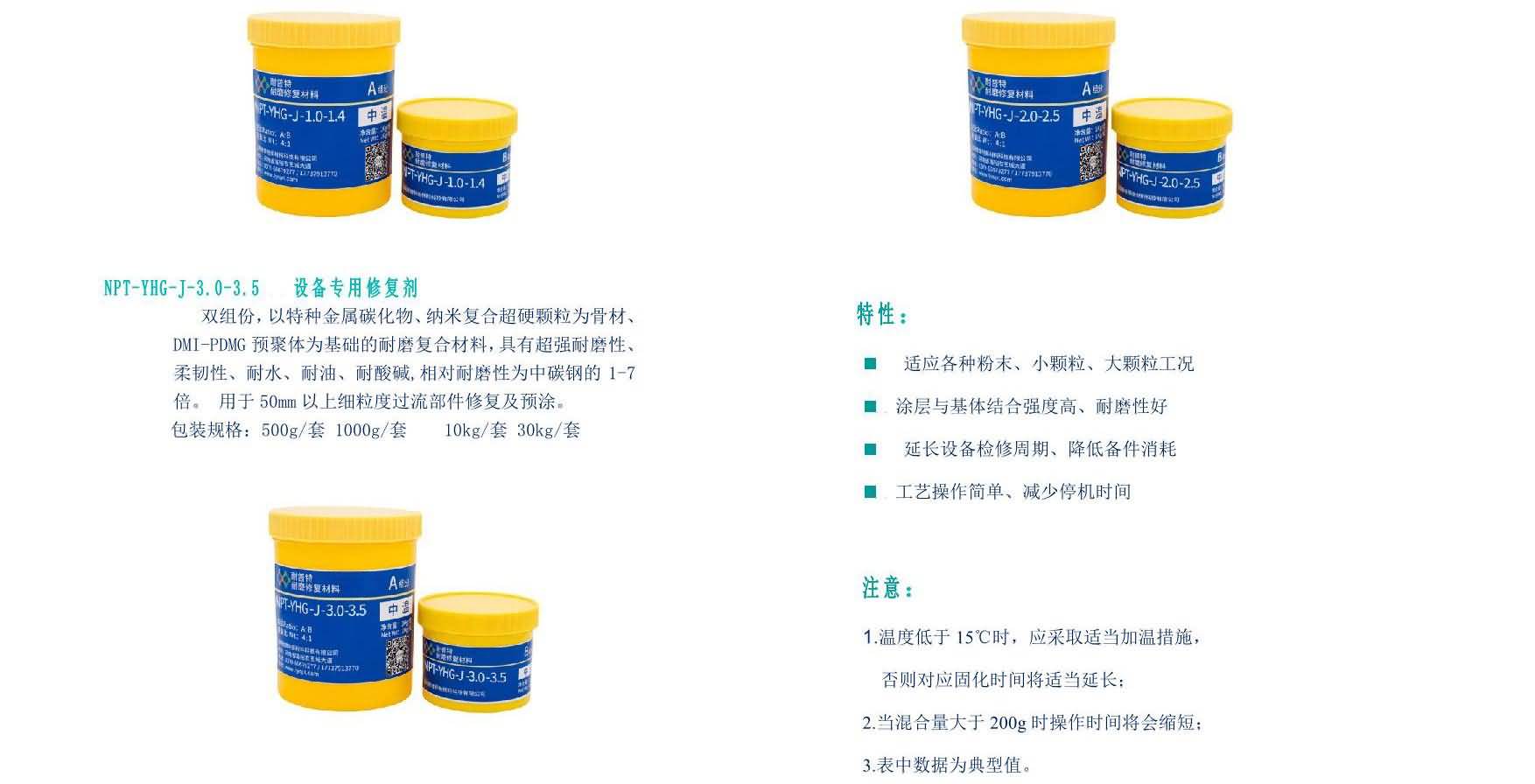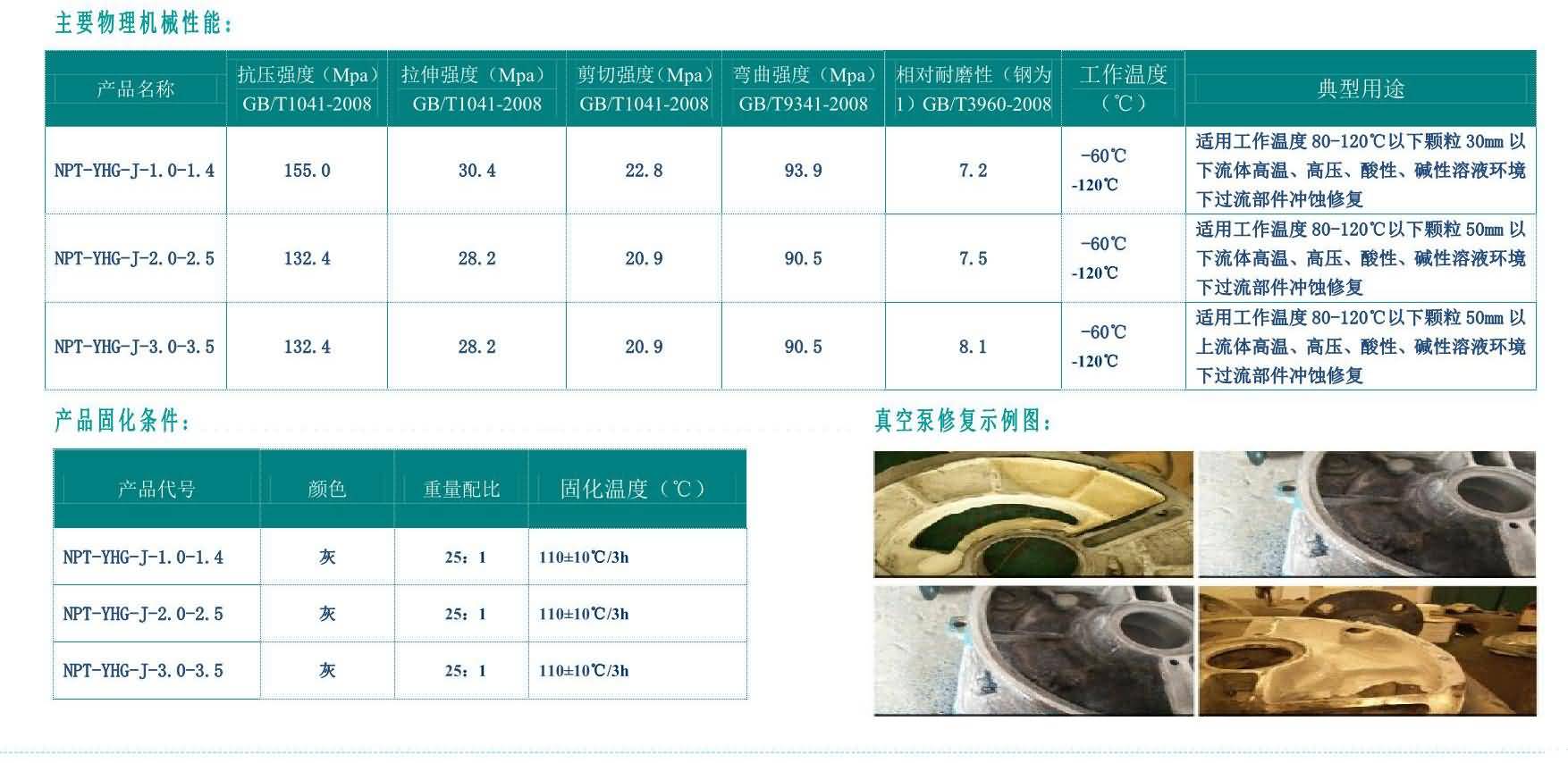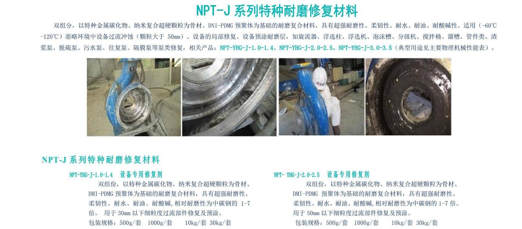 雙組分,以金屬碳化物、納米復合超硬顆粒為骨材、DNI-PDMG預聚體為基礎的耐磨復合材料,具有超強耐磨性、柔韌性、耐水、耐油、耐酸堿性。適用(-60-120℃)惡略環境中設備過流沖蝕(顆粒大于50mm)、設備的局部修復、設備預涂耐磨層,如旋流器、浮選柱、浮選機、泡沫槽、分級機、攪拌桶、溜槽、管件類、渣漿泵、脫硫泵、污水泵、往復泵、隔膜泵等泵類修復(典型用途見主要物理機械性能表)。