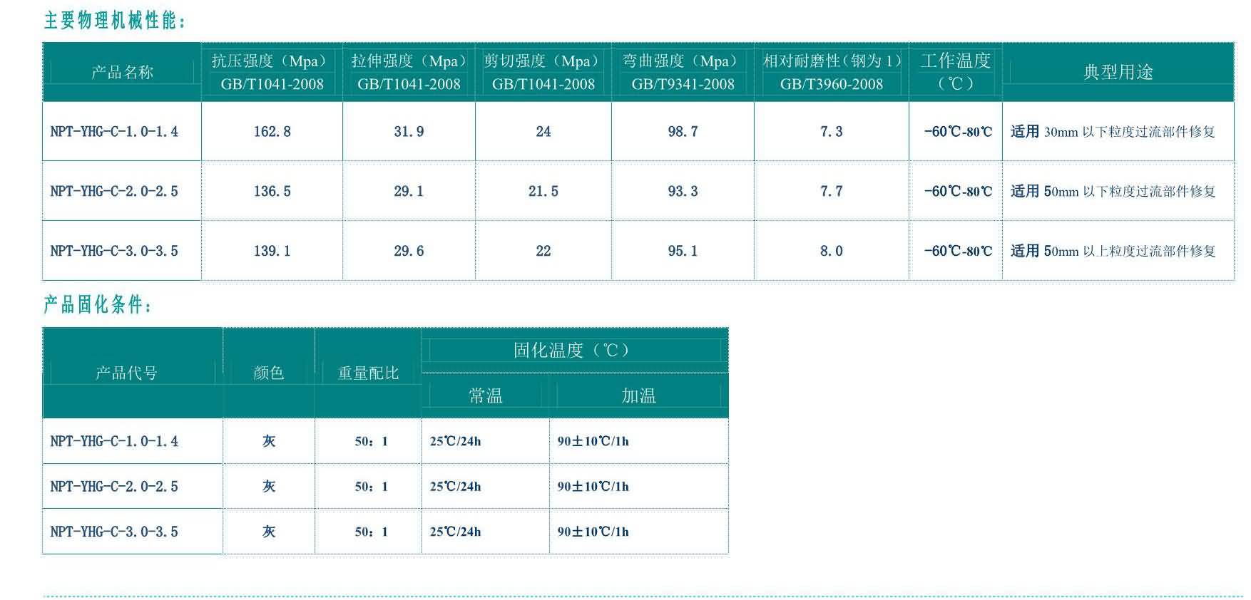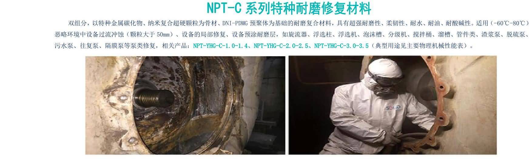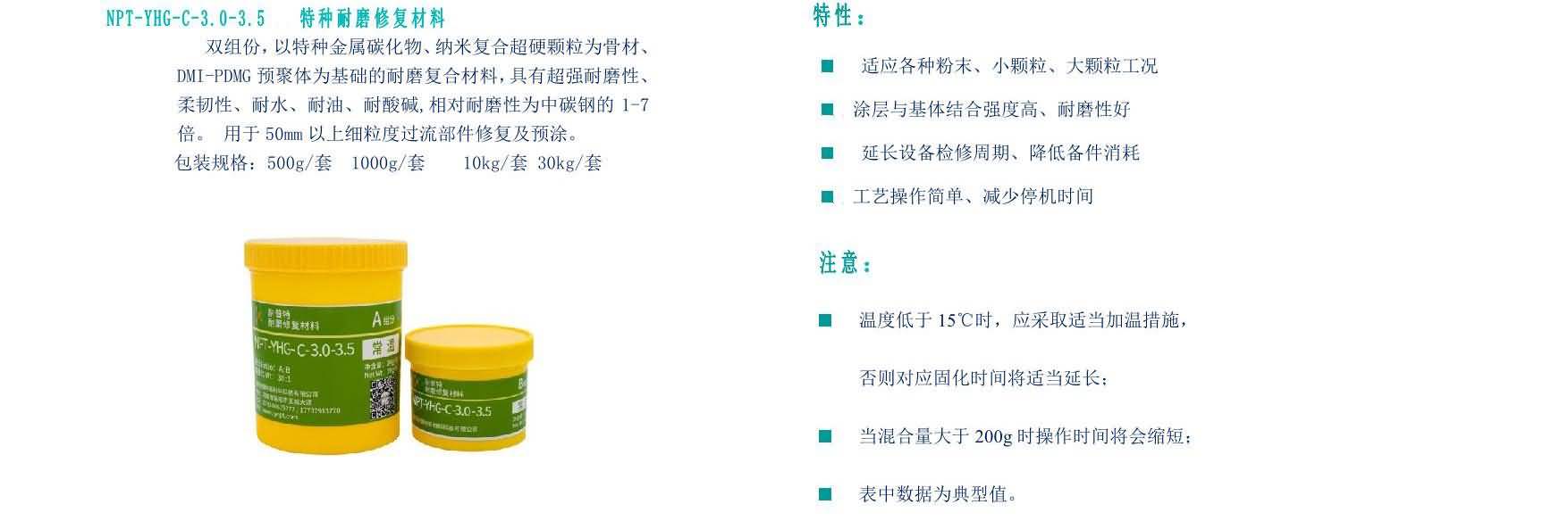 雙組分,以金屬碳化物、納米復合超硬顆粒為骨材、DNI-PDMG預聚體為基礎的耐磨復合材料,具有超強耐磨性、柔韌性、耐水、耐油、耐酸堿性。適用(-60℃-80℃)惡略環(huán)境中設備過流沖蝕(顆粒大于50mm)、設備的局部修復、設備預涂耐磨層,如旋流器、浮選柱、浮選機、泡沫槽、分級機、攪拌桶、溜槽、管件類、渣漿泵、脫硫泵、污水泵、往復泵、隔膜泵等泵類修復(典型用途見主要物理機械性能表)