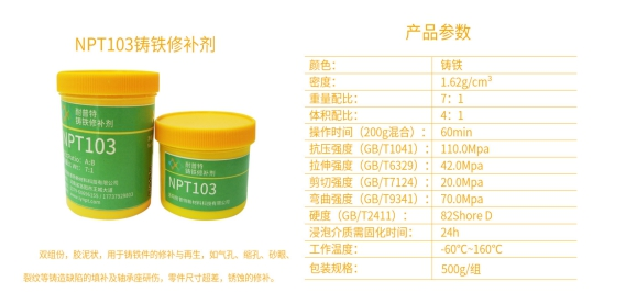 產品用途: 本產品是由改性增韌樹脂與低溫快速固化劑進行復合得到的低溫快固聚合金屬材料,適用于低溫環境中或工期短暫時灰鐵、球鐵等鑄造缺陷的緊急修復以及零件磨損、腐蝕、破裂的緊急修復,修復后具有很高的強度,可與基材一起進行各類機械加工。